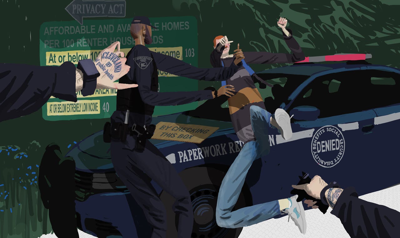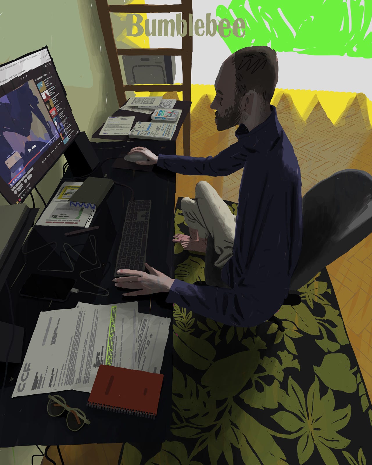 The tenant walks over to the computer, settles in front of the screen, and within five minutes has grown accustomed to the smell of potatoes. As the screen cycles through images, the tenant’s thin legs coil into a spring. A habitual pose—perhaps to improve blood flow to the brain, but more likely the result of nervous tension. The computer plays footage from a police bodycam, showing an officer overstepping his authority in an attempt to arrest one of the protesters out on the street.